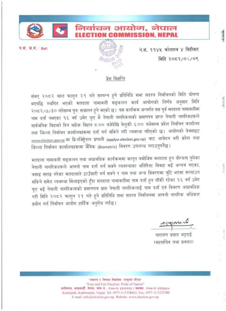 निर्वाचन आयोगले मतदाता नामावली दर्ता प्रक्रिया फेरि सुरु गरेकाे छ। बिहीबार एक विज्ञप्ति जारी गर्दै मतदाता नामावली दर्ता प्रक्रिया सुरु भएको जानकारी दिएको छ।