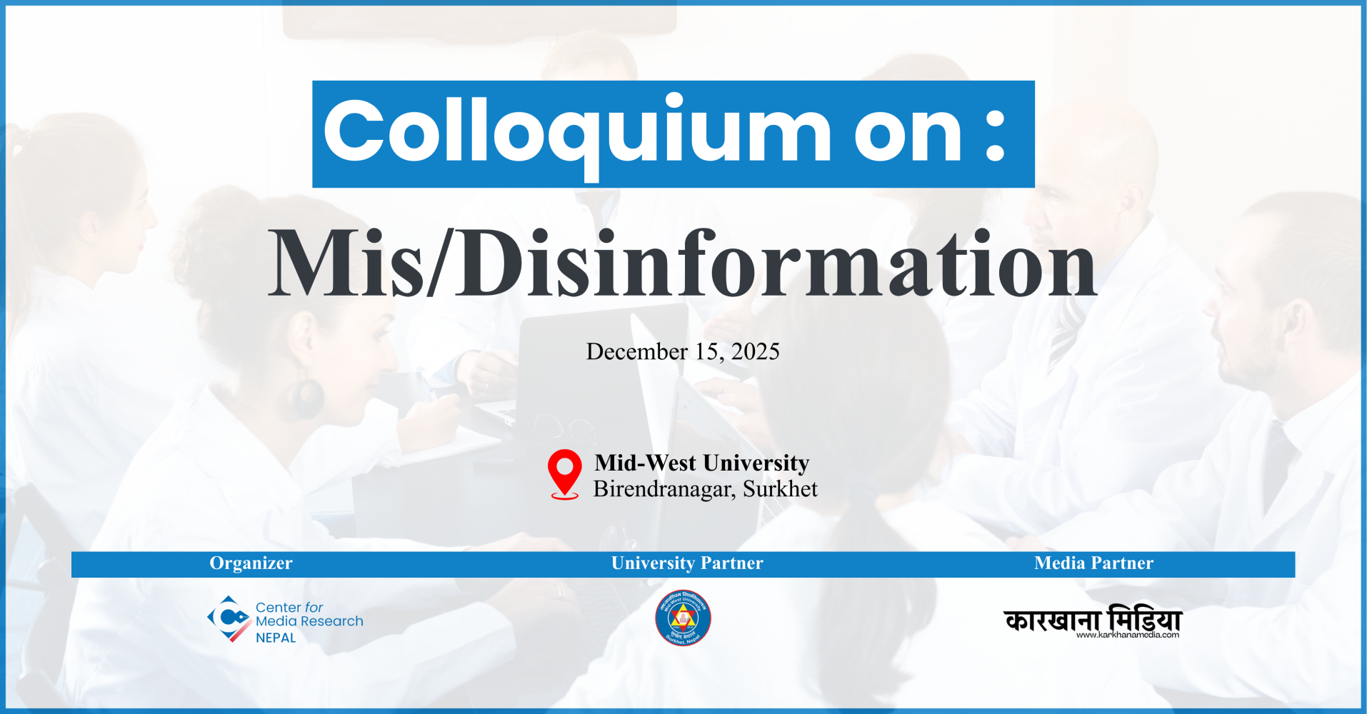 गलत तथा भ्रामक सूचना (Mis/Disinformation) विषयमा केन्द्रित कोलोक्वियम (Colloquium) संवाद कार्यक्रम सोमबार सुर्खेतको वीरेन्द्रनगरमा सम्पन्न भएको छ। सेन्टर फर मिडिया रिसर्च (सीएमआर) नेपालको आयोजनामा तथा मध्यपश्चिम विश्वविद्यालयको सहकार्यमा आयोजित कार्यक्रम विश्वविद्यालयअन्तर्गत ग्राजुएट स्कुल अफ लको सभाहलमा सम्पन्न भएको हो।