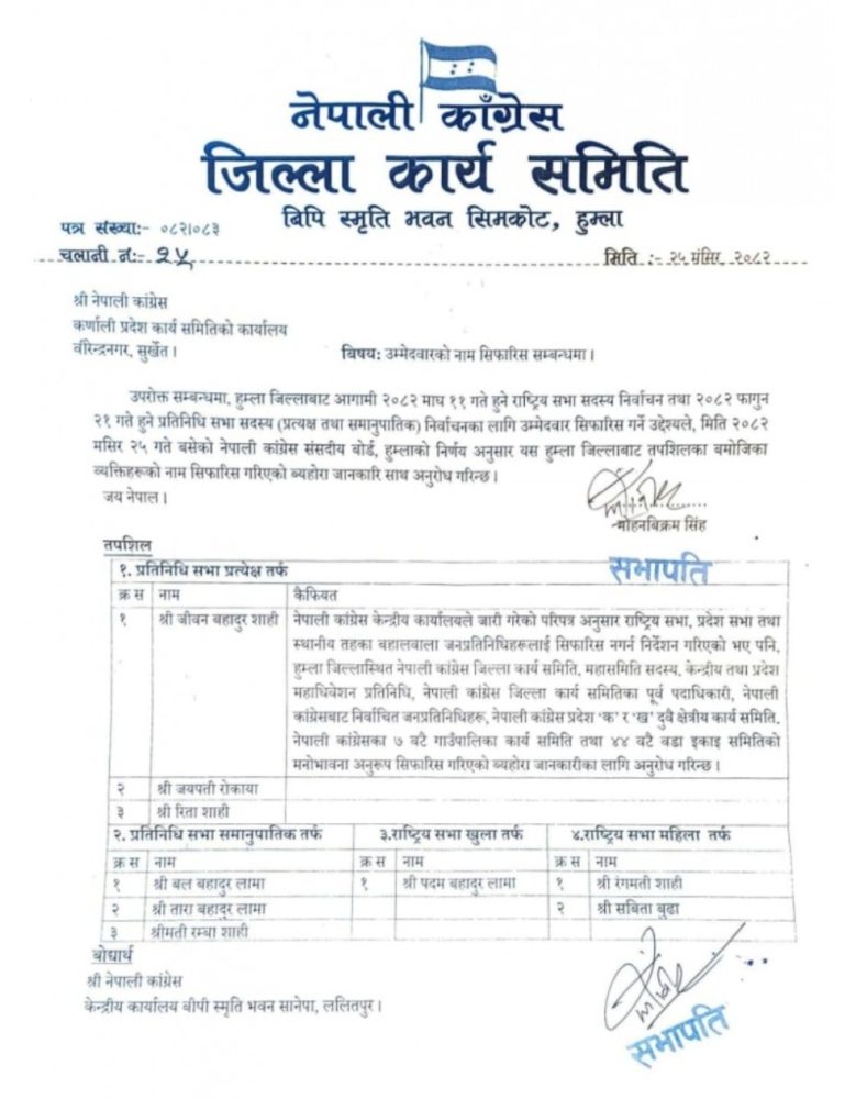 नेपाली काङ्ग्रेस जिल्ला कार्यसमिति हुम्लाबाट सिफारिस गरिएका उम्मेदवार बल बहादुर लामा, रम्बा शाही र तारा बहादुर लामा हुन्। तीन जना मध्ये लामाको नाम बन्दसूचीमा अटाएको हो ।