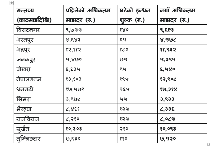 नयाँ भाडा दरअनुसार काठमाडौँ–धनगढी रुटमा सबैभन्दा धेरै २६५ रुपैयाँले भाडा घटेको छ भने काठमाडौँ–सिमरा रुटमा सबैभन्दा कम ५५ रुपैयाँले घटेको छ। यस्तै, माउन्टेन फ्लाइटमा २१० रुपैयाँ, काठमाडौँ–लुक्ला ८० रुपैयाँ, काठमाडौँ–जोमसोम १२० रुपैयाँ, काठमाडौँ–फाप्लु ७० रुपैयाँ, काठमाडौँ–जुम्ला १९० रुपैयाँ र नेपालगन्ज–सिमिकोटमा १२० रुपैयाँ फ्युल सरचार्ज समायोजन गरिएको छ।