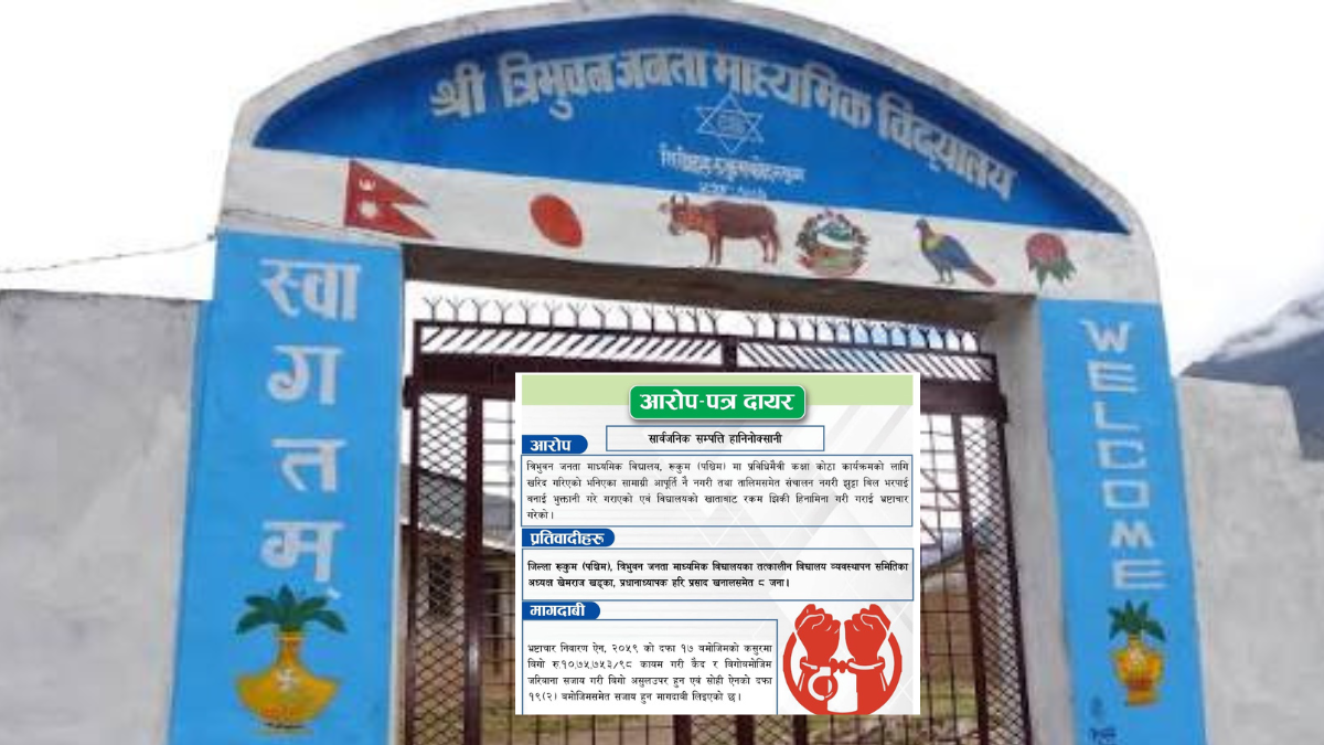 अख्तियार दुरुपयोग अनुसन्धान आयोगले रुकुम (पश्चिम)को त्रिभुवन जनता माध्यमिक विद्यालयमा सार्वजनिक सम्पत्ति हानिनोक्सानी गरेको आरोपमा ८ जनाविरुद्ध विशेष अदालतमा मुद्दा दायर गरेको छ।