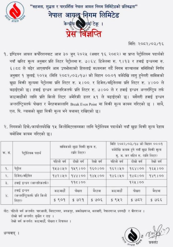 नयाँ मूल्यसूची अनुसार पेट्रोल प्रतिलिटर १ सय ६५ रुपैयाँ र डिजेल तथा मट्टितेलको मूल्य प्रतिलिटर १ सय ४९ रुपैयाँ कायम भएको छ। हवाइ इन्धनमा पनि प्रतिकिलो लिटर ५१ डलर वृद्धि भएको छ।