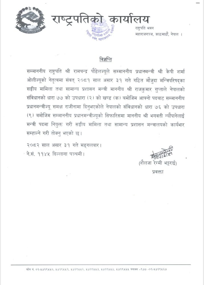 राष्ट्रपतिको कार्यालयकी प्रवक्ता शैलजा रेग्मी भट्टराईद्वारा जारी विज्ञप्तिमा न्यौपानेले मन्त्रालयको कार्यभार सम्हाल्ने उल्लेख गरिएको छ। यसअघि उक्त मन्त्रालयका मन्त्री राजकुमार गुप्ता रहेका थिए । कर्मचारी सरुवामा घुस ७८ लाख घुस मागेको र स्वीकार गरेका मन्त्री गुप्तालाई क्याबिनेटमा राखेर सोमबार बैठक चलाएका ओलीले मंगलबार बिहान राजीनामा दिएका थिए।