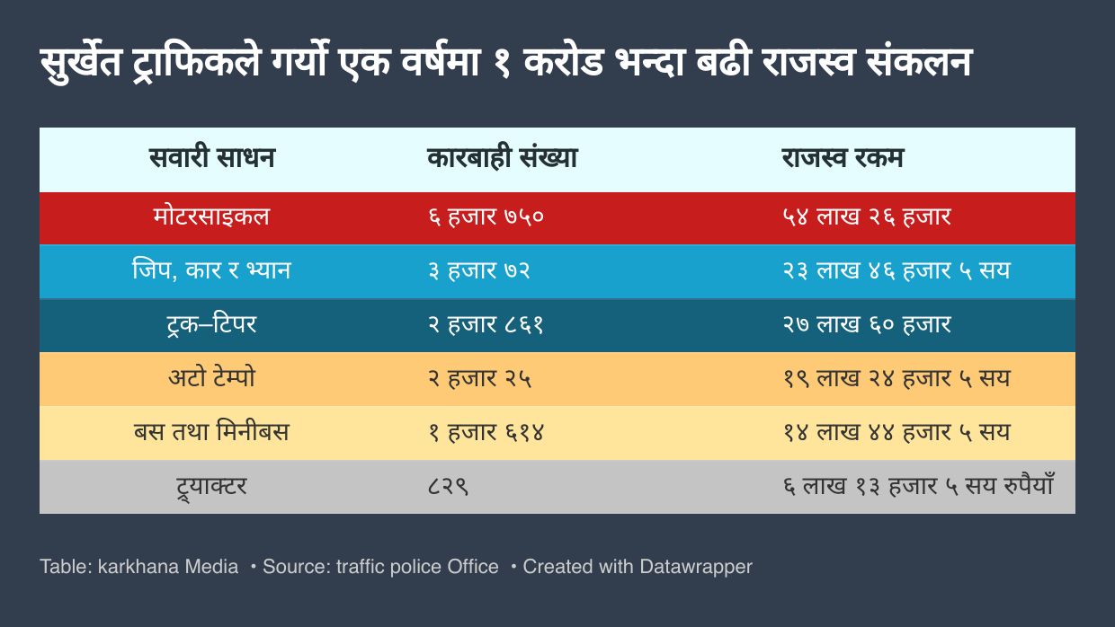 कारबाहीमा परेका सवारीमध्ये सबैभन्दा बढी मोटरसाइकल छन्। पछिल्लो वर्ष ६ हजार ७५० वटा मोटरसाइकललाई कारबाही गरी ५४ लाख २६ हजार रुपैयाँ राजस्व संकलन गरिएको छ।