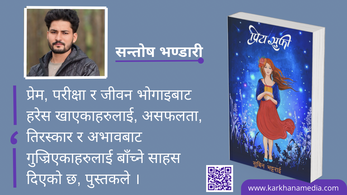 त्योमध्ये मैले पछिल्लो समय पढेको उनको पुस्तक हो, प्रिय सुफी। पुस्तकबारे धेरै साथीहरूबाट, धेरै थरीका प्रतिक्रिया पाएको थिएँ। पुस्तक पढिसकेपछि छोटो समीक्षा नलेखी मनले मानेन। तसर्थ, छोटो समीक्षा लेख्ने प्रयास भने गरेको छु।
